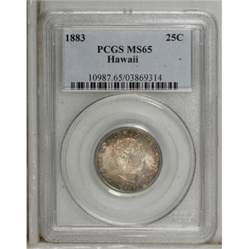 <B>1883 25C Hawaii Quarter MS65 PCGS.</B></I> Mottled golden-brown and navy-blue endow this lustrous and intricately struck example. Neither side has any individually mentionable marks.<BR><BR><b>Shipping:</b> Coins & Currency (<a target="_blank" href="http://www.heritageauctions.com/common/shipping.php">view shipping information</a>)