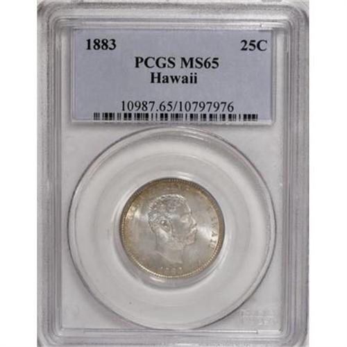 <B>1883 25C Hawaii Quarter MS65 PCGS.</B></I> Highly lustrous with splashes of champagne and autumn-orange toning. The portrait of the king is suitably detailed and free of significant faults. The Hawaii quarter is the most available of the island nation's coins, though Gems are elusive.<BR><BR><b>Shipping:</b> Coins & Currency (<a target="_blank" href="http://www.heritageauctions.com/common/shipping.php">view shipping information</a>)