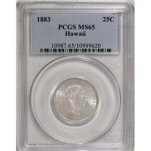 <B>1883 25C Hawaii Quarter MS65 PCGS.</B></I> A minimally toned and shining survivor from the lone quarter issue in Hawaii's history as an independent kingdom. Excellent definition on the portrait and solid preservation.<BR><BR><b>Shipping:</b> Coins & Currency (<a target="_blank" href="http://www.heritageauctions.com/common/shipping.php">view shipping information</a>)
