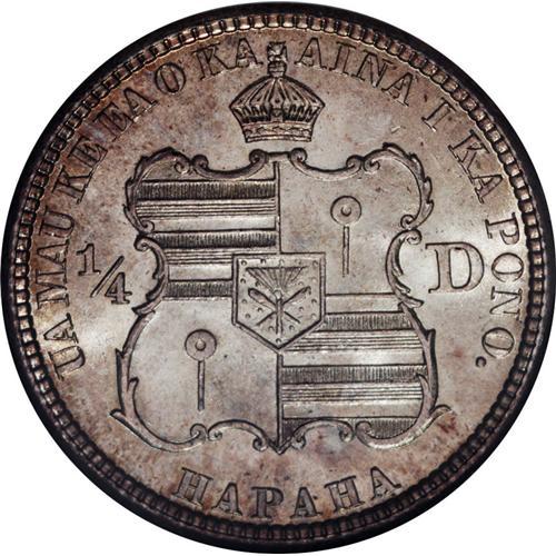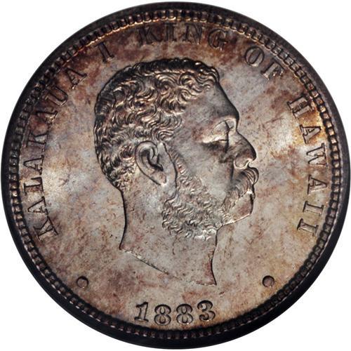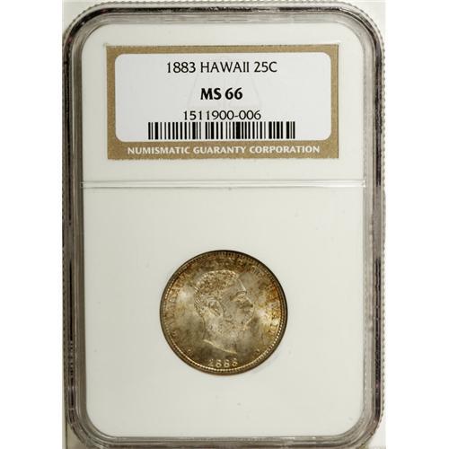 <B>1883 25C Hawaii Quarter MS66 NGC.</B></I> Sprinkled over both sides of this frosty Premium Gem are bits of coppery-gold toning that have a tendency to gravitate to the borders. A lengthy luster graze on Kalakaua's neck and a few small reeding marks in the lower right obverse field limit the grade on this otherwise Superb example.<BR><BR><b>Shipping:</b> Coin/Currency (<a target="_blank" href="http://www.heritageauctions.com/common/shipping.php">view shipping information</a>)