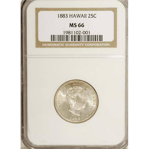 <B>1883 25C Hawaii Quarter MS66 NGC.</B></I> The Hawaiian quarter dollar is also known as the hapaha, the Hawaiian name for this denomination. The strike on this Premium Gem is sharp with full obverse and reverse details. There is no toning on either side, with minimal abrasions. Census: 48 in 66, 4 finer (10/06).<BR><BR><b>Shipping:</b> Coin/Currency (<a target="_blank" href="http://www.heritageauctions.com/common/shipping.php">view shipping information</a>)