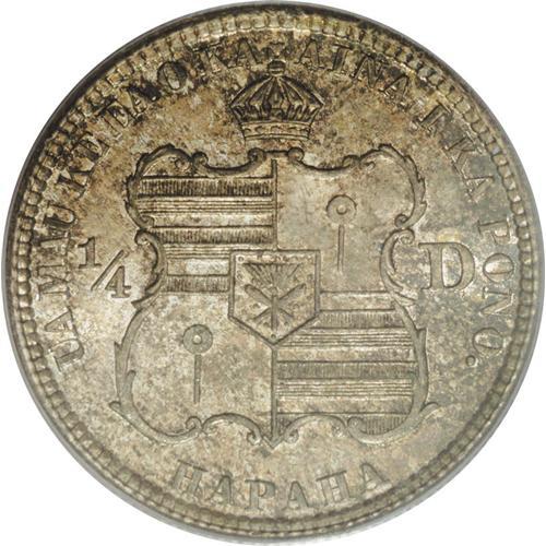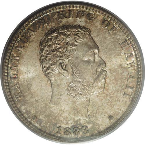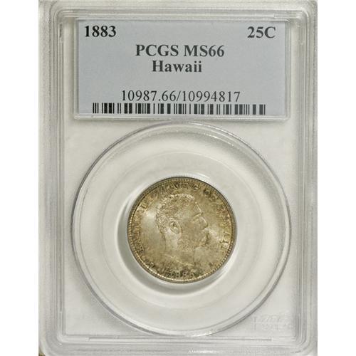 <B>1883 25C Hawaii Quarter MS66 PCGS.</B></I> Both sides of this Hawaii quarter are awash in blazing luster, and are visited with whispers of medium gray, golden-tan, cobalt-blue, and rose patination. A well executed strike has imparted sharp definition to the design elements, and the surfaces are devoid of any significant marks. Population: 62 in 66, 9 finer (2/07).<BR><BR><b>Shipping:</b> Coins & Currency (<a target="_blank" href="http://www.heritageauctions.com/common/shipping.php">view shipping information</a>)