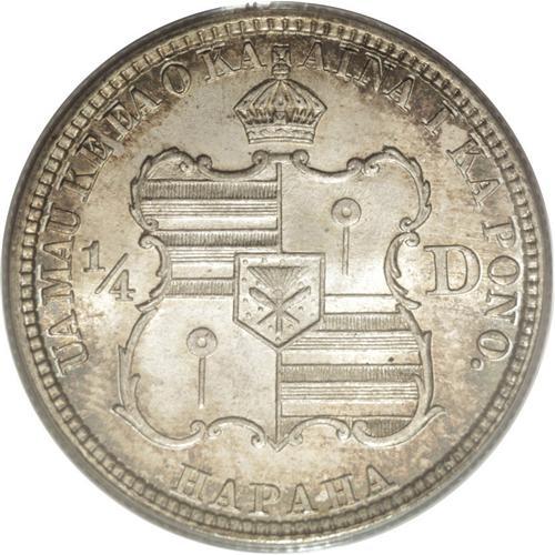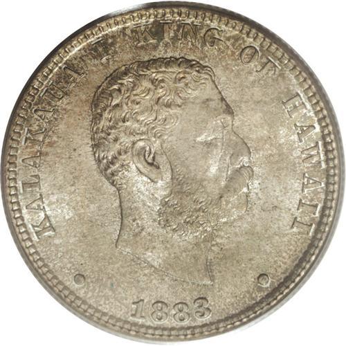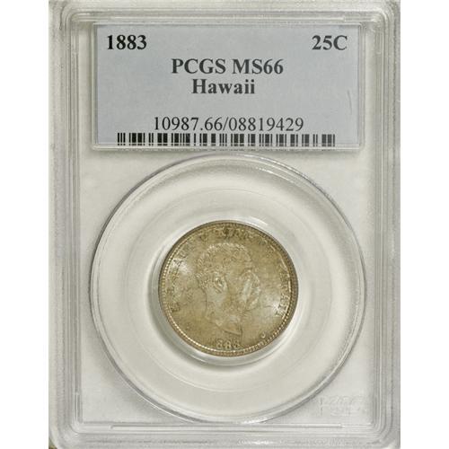 <B>1883 25C Hawaii Quarter MS66 PCGS.</B></I> Cream-gray shades dominate the obverse, with dappled tan-brown and apple-green about the peripheries. The reverse has a nearly brilliant center framed by autumn-brown and sea-green margins. This lustrous Premium Gem is precisely struck, and is immaculate aside from a pair of trivial lines on the cheek. Population: 61 in 66, 9 finer (2/07).<BR><BR><b>Shipping:</b> Coins & Currency (<a target="_blank" href="http://www.heritageauctions.com/common/shipping.php">view shipping information</a>)