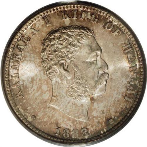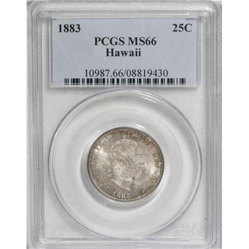 <B>1883 25C Hawaii Quarter MS66 PCGS.</B></I> This is an attractive Premium Gem with brilliant satin luster and full design features. The surfaces are pristine with few marks of any kind on either side. Although not the finest certified, it ranks high in the current population reports. Population: 69 in 66, 9 finer (6/07).<BR><BR><b>Shipping:</b> Coins & Currency (<a target="_blank" href="http://www.heritageauctions.com/common/shipping.php">view shipping information</a>)