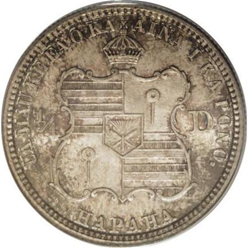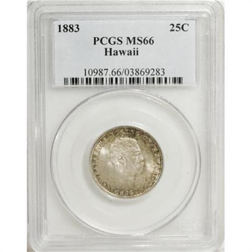 <B>1883 25C Hawaii Quarter MS66 PCGS.</B></I> The official coins issued by the Kingdom of Hawaii include an 1847 cent, depicting King Kamehameha III, an 1881 five cent, and 1883-dated dimes, eighths, quarters, halves, and dollars showing King Kalakaua I. The quarters are the most available of those issues. This piece offers lustrous smoke-gray-gold surfaces that are essentially mark-free and sharply struck.<BR><BR><b>Shipping:</b> Coins & Currency (<a target="_blank" href="http://www.heritageauctions.com/common/shipping.php">view shipping information</a>)