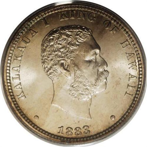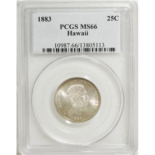 <B>1883 25C Hawaii Quarter MS66 PCGS.</B></I> Premium appeal is the hallmark of this delectable Premium Gem coin, the most available Hawaiian type coin. The largely brilliant silver surfaces show touches of amber-gold at the rims, with gorgeous, radiant luster and few singular abrasions. Population: 70 in 66, 9 finer (7/07).<BR><BR><b>Shipping:</b> Coins & Currency (<a target="_blank" href="http://www.heritageauctions.com/common/shipping.php">view shipping information</a>)