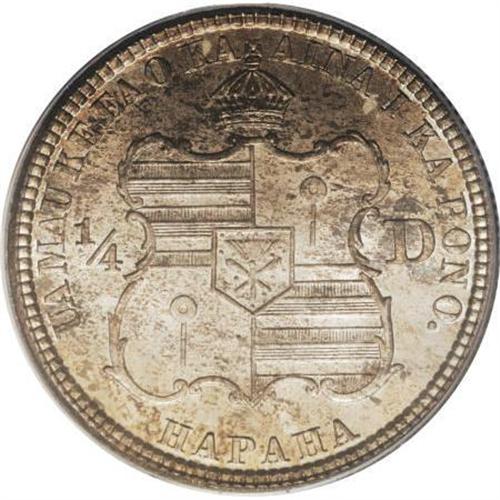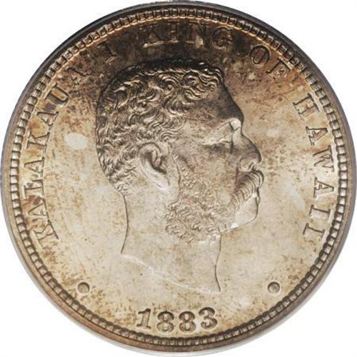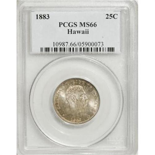 <B>1883 25C Hawaii Quarter MS66 PCGS.</B></I> Glowing luster shines through the coat of speckled golden-tan and sky-blue patina, and the design elements are sharply and evenly struck throughout. The surfaces on both sides have been well cared for, providing an additional boost to the wonderful eye appeal of this Premium Gem Hawaiian quarter. Population: 79 in 66, 9 finer (9/07).<BR><BR><b>Shipping:</b> Coins & Currency (<a target="_blank" href="http://www.heritageauctions.com/common/shipping.php">view shipping information</a>)