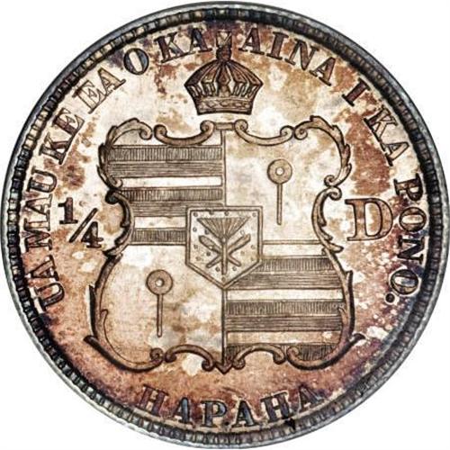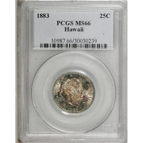 <B>1883 25C Hawaii Quarter MS66 PCGS.</B></I> Splotches of cobalt-blue, lavender, and golden-brown patination race over the radiantly lustrous surfaces of this Premium Gem. A powerful strike results in virtual completeness on the design elements, heightening the overall eye appeal. Exquisitely preserved throughout. Population: 80 in 66, 9 finer (12/07).<BR><BR><b>Shipping:</b> Coins & Currency (<a target="_blank" href="http://www.heritageauctions.com/common/shipping.php">view shipping information</a>)