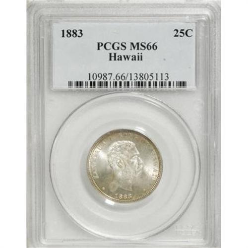 <B>1883 25C Hawaii Quarter MS66 PCGS.</B></I> Breen-8033. The first 8 in the date is recut. Breen believed this variety to be an 1883/1383 blundered date. Golden-brown toning graces the borders of this lustrous and assertively struck Hawaiian type coin. The reverse is particularly void of marks. Population: 79 in 66, 9 finer (11/07).<BR><BR><b>Shipping:</b> Coins & Currency (<a target="_blank" href="http://www.heritageauctions.com/common/shipping.php">view shipping information</a>)