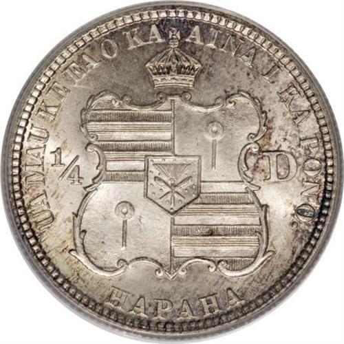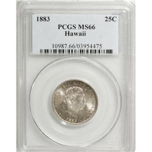 <B>1883 25C Hawaii Quarter MS66 PCGS.</B></I> A flashy example with an alluring lilac patina and excellent luster. Although the Hawaiian half dollar, also issued in 1883, has a higher recorded mintage at nearly 700,000 pieces, the quarter dollar, at a half-million coins, is more available in higher Mint State grades. Examples finer than this are very infrequently encountered. Population: 79 in 66, 9 finer (11/07).<BR><BR><b>Shipping:</b> Coins & Currency (<a target="_blank" href="http://www.heritageauctions.com/common/shipping.php">view shipping information</a>)