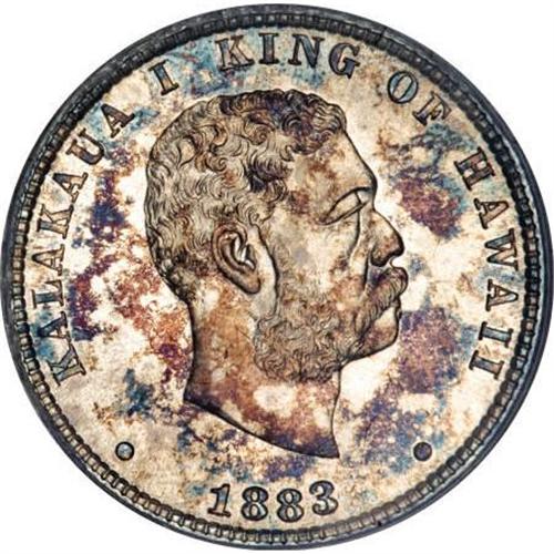 <B>1883 25C Hawaii Quarter MS66 PCGS. CAC.</B></I> Splashes of cobalt-blue, lavender, and golden-brown patination race over the radiantly lustrous surfaces of this Premium Gem. A powerful strike results in virtual completeness on the design elements, heightening the overall eye appeal. Exquisitely preserved throughout. Population: 85 in 66, 9 finer (1/08).<BR><BR><b>Shipping:</b> Coins & Currency (<a target="_blank" href="http://www.heritageauctions.com/common/shipping.php">view shipping information</a>)