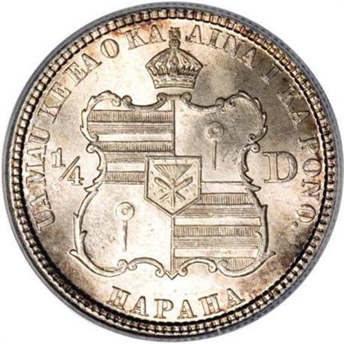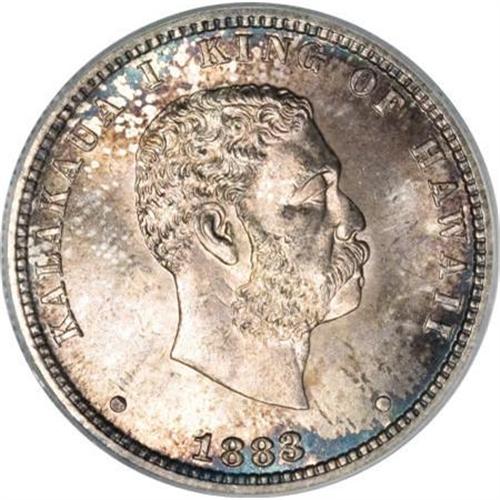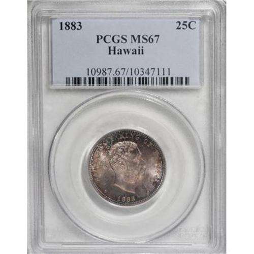 <B>1883 25C Hawaii Quarter MS67 PCGS.</B></I> Of the official Hawaiian silver issues, the quarter is by far the most available issue through all grades, especially in Mint State, thanks to the existence of a long-dispersed hoard of unworn pieces. Even so, precious few examples are known in such fine condition as this delightful coin, decisively struck with practically immaculate surfaces. Each side displays flashy, powerful luster, and while the reverse is largely untoned with just a hint of rose patina at the margins, the obverse has a blend of delightful red-violet, blue-green, and khaki color with small circles of silver-gray color. This immensely appealing piece is tied for the finest Hawaii quarter graded by either NGC or PCGS (6/07).<BR><BR><b>Shipping:</b> Coins & Currency (<a target="_blank" href="http://www.heritageauctions.com/common/shipping.php">view shipping information</a>)