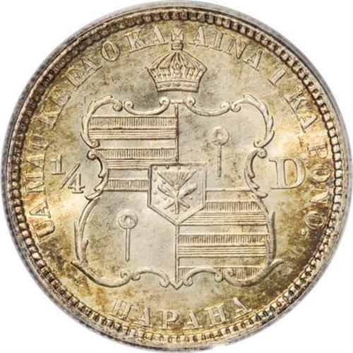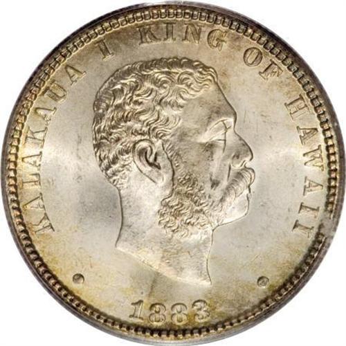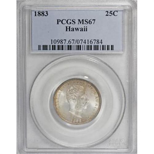 <B>1883 25C Hawaii Quarter MS67 PCGS.</B></I> According to Breen (1988), this issue had an original mintage of 500,000 pieces. After 257,400 were melted, the net mintage was 242,600 coins, plus 26 proofs (the <I>Guide Book</B></I> includes these 26 specimen strikings in the figure of 500,000, but Breen does not). This is a magnificent example which is tied with 13 others as one of the finest-graded, at NGC and PCGS combined (11/07). Fully struck with lovely golden-brown peripheral toning that becomes deeper on the reverse, where elements of cobalt-blue and red-brown coloration are included. Intensely lustrous and exquisitely preserved, this a great Superb Gem representative of the onetime-only 1883 Hawaii quarter. <BR><BR><b>Shipping:</b> Coins & Currency (<a target="_blank" href="http://www.heritageauctions.com/common/shipping.php">view shipping information</a>)