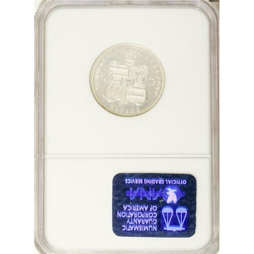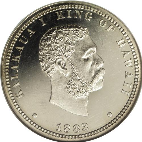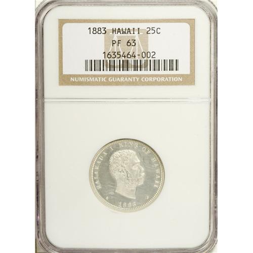 <B>1883 25C Hawaii Quarter PR63 NGC.</B></I> The mintage of the proof 1883 Hawaii quarter (or Hapaha) is a mere 26 pieces. Most Hawaiian collectors have never seen an example, and typically, years pass between auction appearances. It has been more than nine years since the last Heritage auction offering, in our New York ANA Signature back in August 1997. This one-year type coin was designed by Chief Engraver Charles Barber, and was struck at the Philadelphia Mint. This is a sharply struck specimen with nearly complete definition on the King's beard. Icy devices appear to merit a Cameo designation, which is presumably absent from the insert due to the older generation NGC holder. Fully brilliant, and only faintly hairlined for the grade. A small lamination on the reverse rim at 7 o'clock will identify the present piece in any future appearances. Census: 3 in 63, 0 finer (11/06).<BR><BR><b>Shipping:</b> Coin/Currency (<a target="_blank" href="http://www.heritageauctions.com/common/shipping.php">view shipping information</a>)