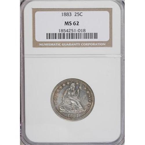 <B>1883 25C MS62 NGC.</B></I> NGC Census: (5/56). PCGS Population (10/54). Mintage: 14,400. Numismedia Wsl. Price for NGC/PCGS coin in MS62: $535. (#5515)<BR><BR><B>Coin Engraver:</B> Christian Gobrecht<BR><BR><b>Shipping:</b> Coins & Currency (<a target="_blank" href="http://www.heritageauctions.com/common/shipping.php">view shipping information</a>\)