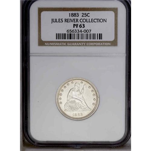 <B>1883<25C> PR63 NGC.</B></I> A pinpoint-sharp Quarter, nicely frosted but without a Cameo designation from NGC. A hint of apricot color prevents full brilliance. An occasional wispy hairline in the fields decides the grade. The Philadelphia Mint was busy making other denominations in 1883, and less than 15,500 Quarters were struck, a figure that combines proofs and business strikes.