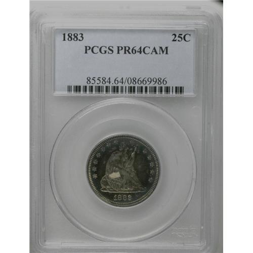 <B>1883<25C> PR64 Cameo PCGS.</B></I> Iridescent blue, amber, and magenta complete for territory on this well struck and still highly lustrous near-Gem example. A curlicue strike-through is noted near the Y in LIBERTY, but the surfaces overall suggest a higher grade. Population: 16 in 64 Cameo, 20 finer (8/06).