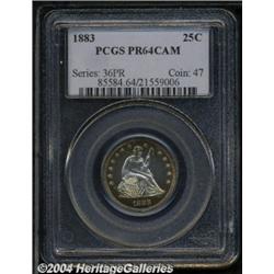 <B>1883<25C> PR64 Cameo PCGS.</B></I> The moderately frosted main devices appear to float upon the deep, watery fields on this stunning cameo. Relatively deep blue, lavender, and russet borders frame the nearly brilliant centers, further enhancing the cameo effect. The design details are sharply struck, and the proof fields reveal just a few wispy hairlines that help to determine the grade. Population: 9 in 64, 10 finer (3/04). <BR><BR><B>Important notice:</B> Heritage usually auctions material at the rate of 200-250 lots per hour. On some occasions eBay Live bid software or the Internet may not be able to keep up with the pace of the auction. We recommend placing a realistic absentee bid now as insurance to avoid disappointment. Occasionally the auctioneer may eliminate or reject an eBay Live bid, and the auctioneer may also reopen a lot after the close of the eBay live bidding (usually because we missed an audience bid), and may reject your bid even if it shows you as the winning bidder. By bidding via eBay Live, you agree that Heritage may award the lot to another bidder at its sole discretion under the circumstances described above or any other reasonable circumstances. Since eBay bids are not shown to us until we open the lot on the floor, we treat those bids just like floor bids. In most cases the floor responds before the eBay bid is presented to us, due to Internet lag time, so for consistency we have made it a policy that floor bids are always considered first over tie eBay live bids. Also please note that all Heritage lots purchased through eBay Live carry a 20% Buyer's Premium. Please make sure you read the Terms and Conditions before you bid.