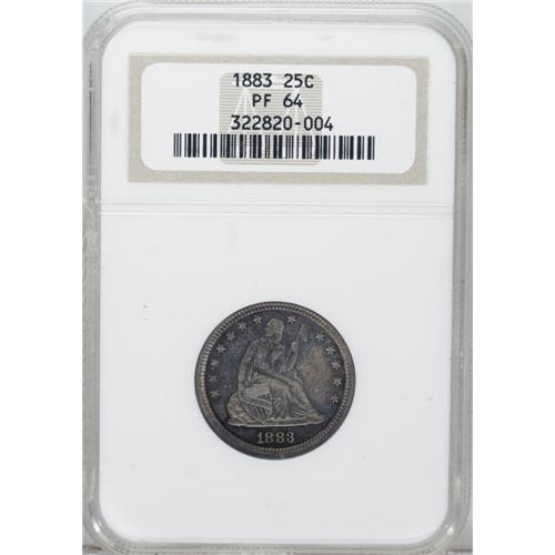 <B>1883 25C PR64 NGC.</B></I> Rich cherry-red, sky-blue, and gold endow this moderately flashy near-Gem. The strike is exacting, and the sole imperfection is a mint-made strike-through on the reverse at 5 o'clock. The older generation holder has a small sliver broken off, which does not effect the preservation of the coin itself.<BR><BR><b>Shipping:</b> Coins & Currency (<a target="_blank" href="http://www.heritageauctions.com/common/shipping.php">view shipping information</a>)