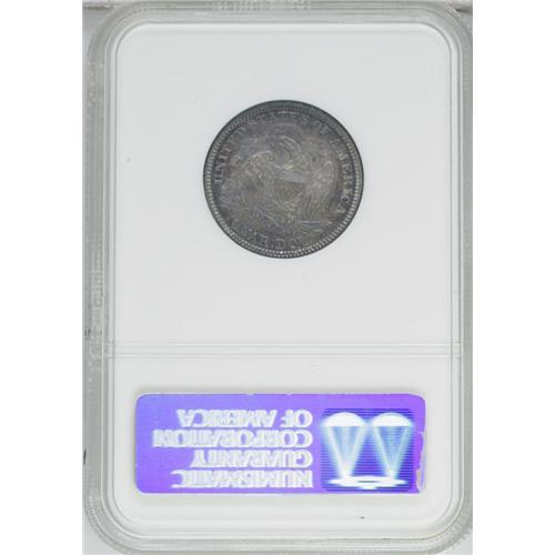 1883 25C PR64 NGC. Rich cherry-red, sky-blue, and gold