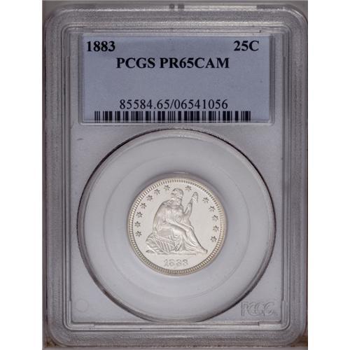 <B>1883<25C> PR65 Cameo PCGS.</B></I> Lightly frosted devices gently contrast with the reflective fields. A boldly struck Gem with a brilliant obverse and pale gold toning on the reverse. A low mintage date: proofs and business strikes combined for only 15,439 pieces. Population: 11 in 65 Cameo, 8 finer (1/06).