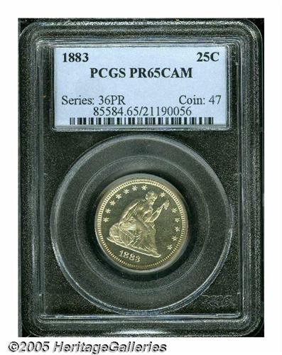<B>1883<25C> PR65 Cameo PCGS.</B></I> Nice lightly cameoed example with rose color rims and good contrast. Some minute planchet flaws are noted only under very close inspection.