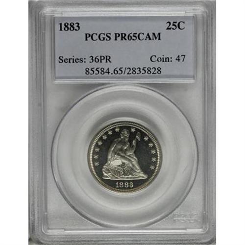 <B>1883 25C PR65 Cameo PCGS.</B></I> Briggs 1-A: "Tops of an extra '83' show in the dentils below the two '8's of date" (Larry Briggs, <I>The Comprehensive Encyclopedia of United States Liberty Seated Quarters</B></I>). The motifs of this stunning Gem cameo appear to float over the deep watery fields, generating amazing eye appeal. Both faces are immaculately preserved. Population: 14 in 65 Cameo, 6 finer (8/07).<BR><BR><b>Shipping:</b> Coins & Currency (<a target="_blank" href="http://www.heritageauctions.com/common/shipping.php">view shipping information</a>)