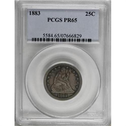 <B>1883 25C PR65 PCGS.</B></I> Medium intensity cobalt-blue and mauve-gray patina occupy the nicely preserved surfaces of this Gem proof. The design elements are sharply and evenly struck. Population: 36 in 65, 26 finer (8/07).<BR><I>From The Beau Clerc Collection.</B></I><BR><BR><B>Coin Engraver:</B> Christian Gobrecht<BR><BR><b>Shipping:</b> Coins & Currency (<a target="_blank" href="http://www.heritageauctions.com/common/shipping.php">view shipping information</a>)