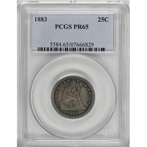 <B>1883 25C PR65 PCGS.</B></I> Medium intensity cobalt-blue and mauve-gray patina occupy the nicely preserved surfaces of this Gem proof. The design elements are sharply and evenly struck. Population: 36 in 65, 28 finer (1/08).<BR><BR><B>Coin Engraver:</B> Christian Gobrecht<BR><BR><b>Shipping:</b> Coins & Currency (<a target="_blank" href="http://www.heritageauctions.com/common/shipping.php">view shipping information</a>)