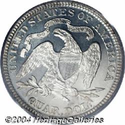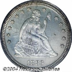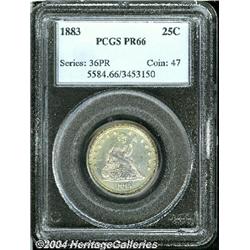 <B>1883<25C> PR66 PCGS.</B></I> This is a lovely Gem Proof with reflective silver fields and lustrous devices. This is perhaps a borderline Cameo Proof. Both sides, but especially the obverse, have light peripheral champagne toning. Design details are quite bold. This splendid Proof will no doubt make some date or type collector quite happy. <BR><BR><B>Important notice:</B> Heritage usually auctions material at the rate of 200-250 lots per hour. On some occasions eBay Live bid software or the Internet may not be able to keep up with the pace of the auction. We recommend placing a realistic absentee bid now as insurance to avoid disappointment. Occasionally the auctioneer may eliminate or reject an eBay Live bid, and the auctioneer may also reopen a lot after the close of the eBay live bidding (usually because we missed an audience bid), and may reject your bid even if it shows you as the winning bidder. By bidding via eBay Live, you agree that Heritage may award the lot to another bidder at its sole discretion under the circumstances described above or any other reasonable circumstances. Since eBay bids are not shown to us until we open the lot on the floor, we treat those bids just like floor bids. In most cases the floor responds before the eBay bid is presented to us, due to Internet lag time, so for consistency we have made it a policy that floor bids are always considered first over tie eBay live bids. Also please note that all Heritage lots purchased through eBay Live carry a 20% Buyer's Premium. Please make sure you read the Terms and Conditions before you bid.