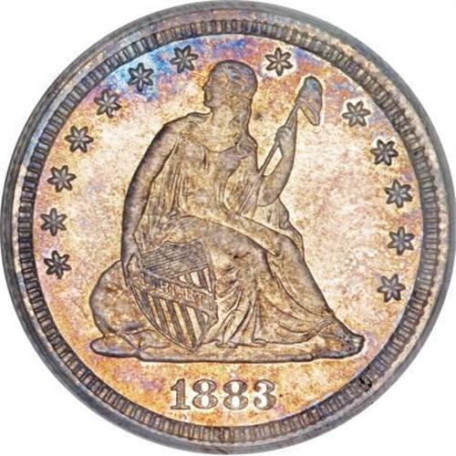 <B>1883 25C PR66 PCGS.</B></I> A gorgeous Premium Gem proof with amazing eye appeal created by light gold toning blended with deeper lilac and blue that is splashed near the borders. Although not designated as a Cameo proof, it appears to qualify, and probably would except for the toning. Population: 21 in 66, 7 finer (1/08).<BR><BR><B>Coin Engraver:</B> Christian Gobrecht<BR><BR><b>Shipping:</b> Coins & Currency (<a target="_blank" href="http://www.heritageauctions.com/common/shipping.php">view shipping information</a>)