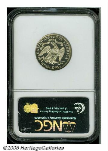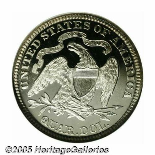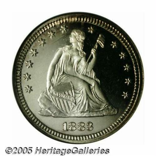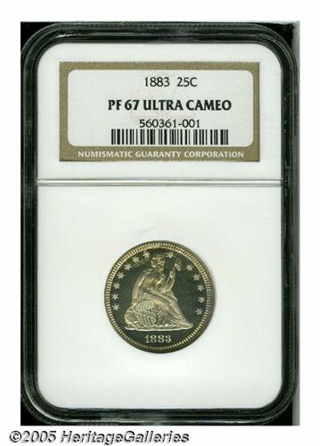 <B>1883<25C> PR67 Deep Cameo NGC.</B></I> While a fair number of proofs from this year have received the Cameo designation, the 1883 is inexplicably rare as a Deep Cameo. In fact, this is one of only two Gem Deep Cameo specimens certified by both major services and the finest by two points. The contrast is profound on each side with chalk-white devices and illimitable depth of mirrored reflectivity in the fields. Free from any mentionable surface defects, there is just the slightest hint of light golden toning present around the peripheries on each side. Population: 1 in 67 Ultra Cameo, 0 finer (3/05).