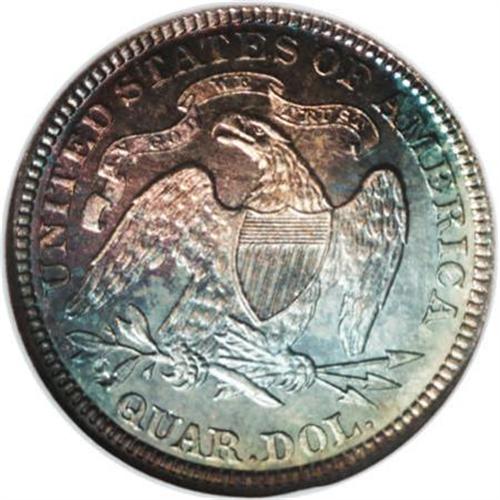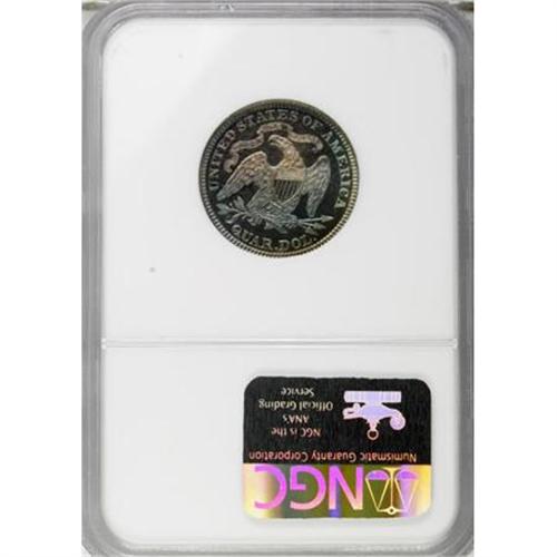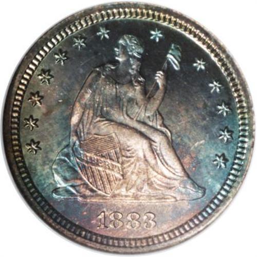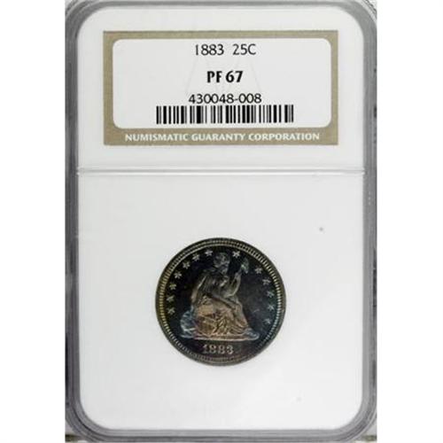 1883 25C PR67 NGC. A pinpoint-sharp Superb Gem with delightful ocean-blue and apricot toning. A small mint-made strike-through on the reverse touches one of the olive leaves. Because of heavy silver dollar production, quarters were struck in only limited numbers between 1879 and 1890, except for an anomalous large mintage at San Francisco in 1888.<BR><BR><b>Shipping:</b> Coins & Currency (<a target="_blank" href="http://www.heritageauctions.com/common/shipping.php">view shipping information</a>)