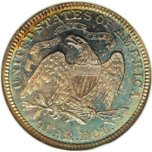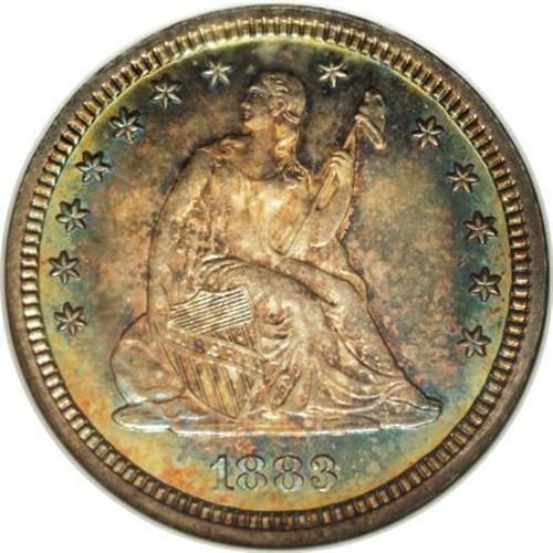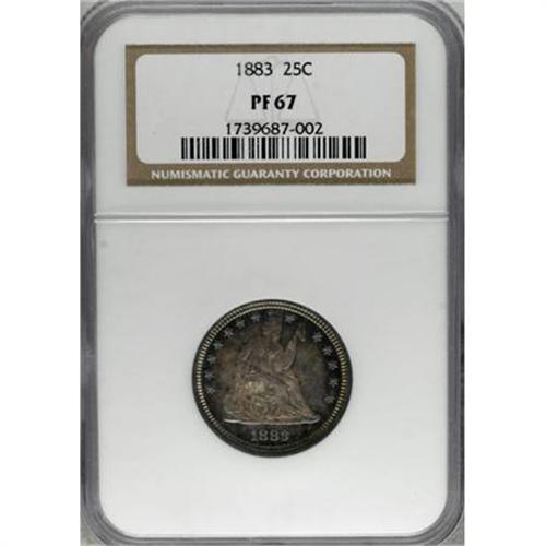 <B>1883 25C PR67 NGC.</B></I> A spectacularly toned and exquisitely preserved representative of this later proof Seated quarter issue, crisply struck with tremendous visual appeal. The obverse has outer bands of sea-green and sky-blue patina around a gold-gray center, while the reverse exhibits sapphire toning and rose-gray devices. Census: 16 in 67, 2 finer (6/07).<BR><BR><B>Coin Engraver:</B> Christian Gobrecht<BR><BR><b>Shipping:</b> Coins & Currency (<a target="_blank" href="http://www.heritageauctions.com/common/shipping.php">view shipping information</a>\)