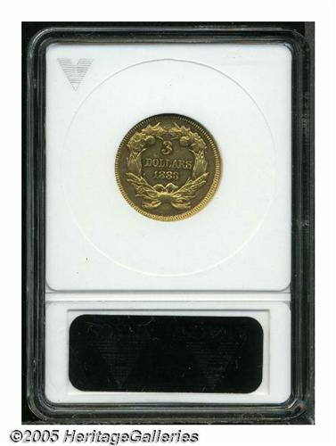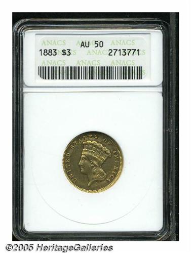 <B>1883<$3> AU50 ANACS.</B></I> This issue has the distinction of ranking among a handful of thee-dollar gold coins with mintages under 1,000 coins. In this case, a total of 900 business strikes and 89 proofs were issued. This sharply struck example has prooflike fields that are marred by only a few tiny surface marks.