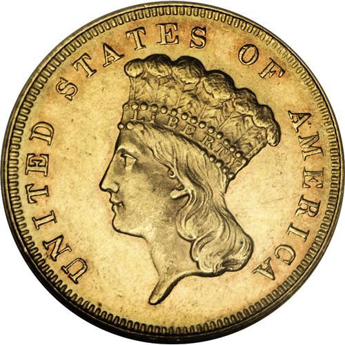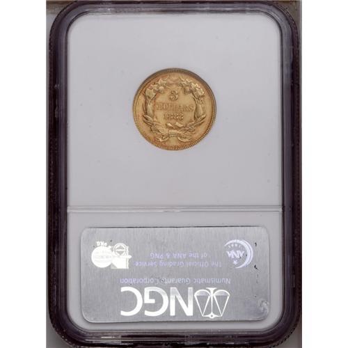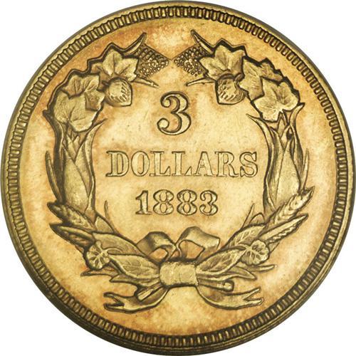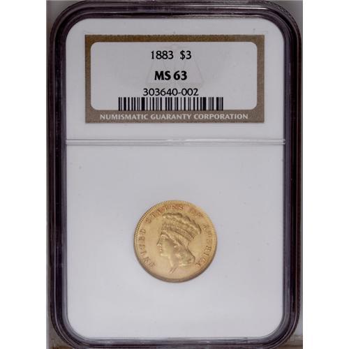 <B>1883 $3 MS63 NGC.</B></I> An even finer representative of this prized three dollar rarity. While displaying only average sharpness, the surfaces display a predictable degree of reflectivity and are tinged in attractive coppery-orange patina. Minor abrasions in the fields are the primary grade-limiting factor. Census: 9 in 63, 17 finer (1/06).