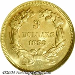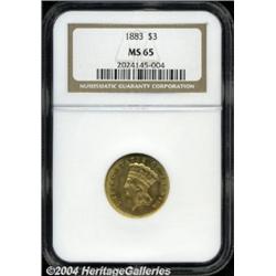 <B>1883<$3> MS65 NGC.</B></I> The 1883 has one of the lowest mintages of the series with only 900 pieces struck. It is a genuinely rare coin that apparently did circulate to some degree as most survivors are XF or AU, and Mint State pieces are quite elusive. In Gem condition, the 1883 is of the utmost rarity and importance, only six other pieces have been so graded by both services combined.<BR> The surfaces of this piece have the full, frosted mint luster that is so prevalent on high grade threes. Fully struck in all areas, the surfaces are minimally abraded. For pedigree purposes, one small diagonal mark is seen on Liberty's nose. <BR><BR><B>Important notice:</B> Heritage usually auctions material at the rate of 200-250 lots per hour. On some occasions eBay Live bid software or the Internet may not be able to keep up with the pace of the auction. We recommend placing a realistic absentee bid now as insurance to avoid disappointment. Occasionally the auctioneer may eliminate or reject an eBay Live bid, and the auctioneer may also reopen a lot after the close of the eBay live bidding (usually because we missed an audience bid), and may reject your bid even if it shows you as the winning bidder. By bidding via eBay Live, you agree that Heritage may award the lot to another bidder at its sole discretion under the circumstances described above or any other reasonable circumstances. Since eBay bids are not shown to us until we open the lot on the floor, we treat those bids just like floor bids. In most cases the floor responds before the eBay bid is presented to us, due to Internet lag time, so for consistency we have made it a policy that floor bids are always considered first over tie eBay live bids. Also please note that all Heritage lots purchased through eBay Live carry a 20% Buyer's Premium. Please make sure you read the Terms and Conditions before you bid. </span></font></tr></table></td></tr></table>