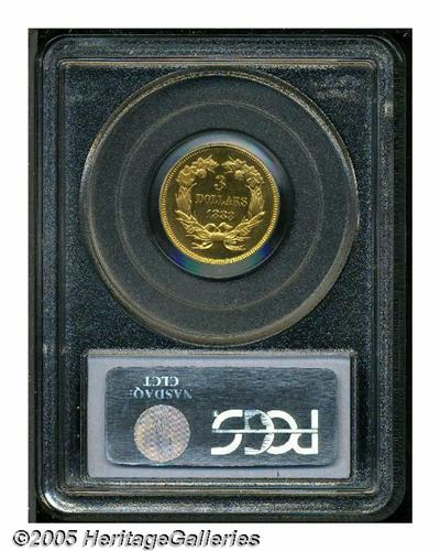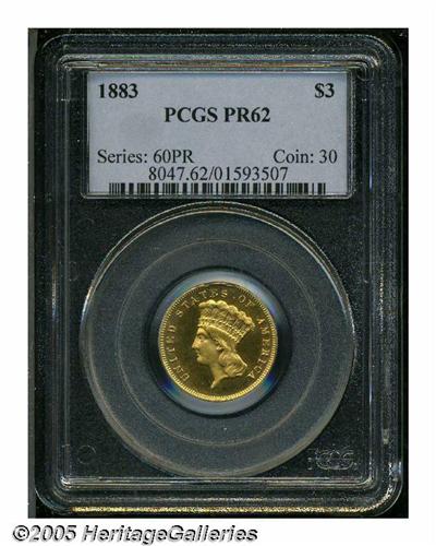 <B>1883<$3> PR62 PCGS.</B></I> A superior example of this rare proof Three Dollar. Both business strikes and proofs are considerable rarities with only 900 and 89 minted of each. While the sparkling, mirrored fields have taken on a bit of haziness which tends to subdue the intense flash they once had, the lightly frosted devices provide a modest cameo contrast. A wire rim encircles each side of this brilliant proof.
