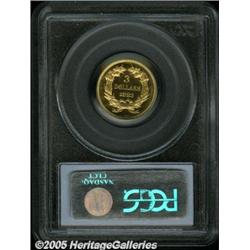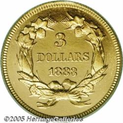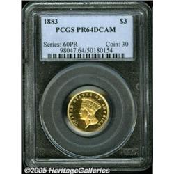 <B>1883 $3 PR64 Deep Cameo PCGS.</B></I> With paltry original mintages across the board, the proof Three Dollar series is in the province of advanced collectors. For such numismatists, we are proud to offer this near-Gem quality survivor from one of the last years of this odd denomination. The 89 proof specimens that emerged from the Philadelphia mint this year carry low dates that slant down to the viewer's right. In addition to this diagnostic feature, this specimen exhibits a pleasing cameo contrast that further enhances the visual impact of the boldly impressed devices. Honey-gold hues overlay the golden surfaces, although we note that there are no hairlines or impairments worthy of individual mention. A lovely example, this coin deserves a bid that does justice to its memorable eye appeal. Population: 5 in 64 Deep Cameo, 8 finer (2/05).