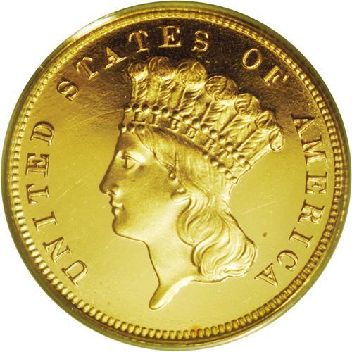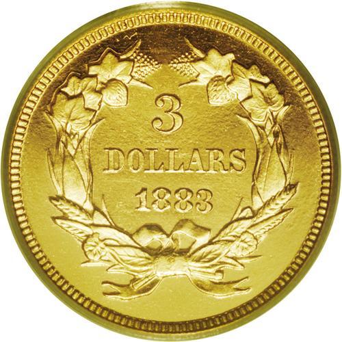 <B>1883<$3> PR65 Deep Cameo PCGS.</B></I> A superior example of this rare proof three dollar gold coin. Both business strikes and proofs are considerable rarities with only 900 and 89 pieces produced respectively of each. This is a stunning cameo proof with illimitable depth of mirrored reflectivity in the fields. The mint frost on the devices is considerable and starkly sets the devices against the black pools of reflectivity in the fields. The surfaces are essentially defect-free, close examination with a glass only reveals a stray hairline here and there. The fields have the orange-peel effect often seen on this date and others from the 1880s, yielding even more visual interest to this significant rarity. Population: 3 in 65 Deep Cameo, 8 finer (4/06).