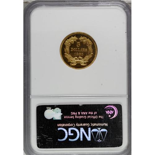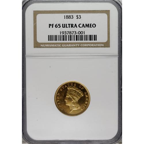 <B>1883 $3 PR65 Ultra Cameo NGC.</B></I> Regardless of the date, proof three dollar gold pieces are rare coins. Just 89 proofs were struck in 1883, and apparently a high percentage of these were saved, according to Jeff Garrett and Ron Guth (2006). Deep or Ultra Cameo specimens are few and far between, however.<BR> In addition to the Pittman Collection, examples also appeared in the Eliasberg, Trompeter, Bass, Garrett, and Bareford sales, as well as a single piece in the Smithsonian Institution. According to our notes, this is just the 22nd appearance of this date in any Heritage sale dating back to 1975, including multiple appearances of a smaller number of coins. Nearly all of those known today are in lower numerical grades. This rich yellow-gold Gem has hints of honey-gold color with deeply reflective fields around highly lustrous devices. A few tiny toning spots are visible with careful examination. Although plate matching is difficult, this example appears to be different than any of those pieces mentioned above. Census: 5 in 65 Ultra Cameo, 1 finer (3/07).<BR><BR><b>Shipping:</b> Coins & Currency (<a target="_blank" href="http://www.heritageauctions.com/common/shipping.php">view shipping information</a>)