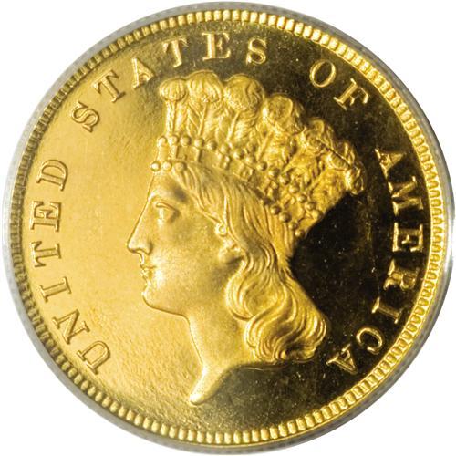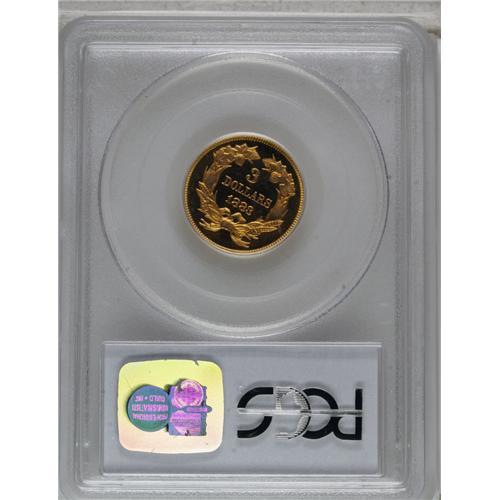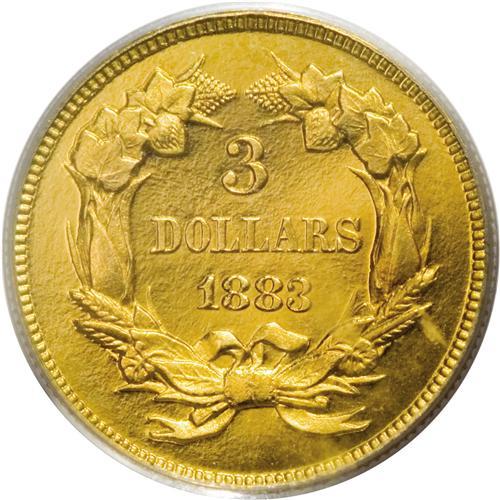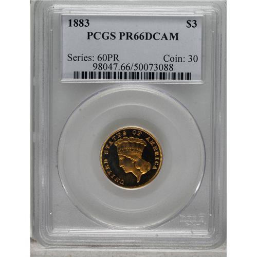 <B>1883 $3 PR66 Deep Cameo PCGS.</B></I> This date is a well known rarity to collectors of three dollar gold pieces. Only 900 business strikes were produced in addition to 89 proofs. As one might imagine from such a small mintage of business strikes, early business strikes display considerable prooflikeness in the fields. In the past, there was some confusion between these first-strike business strikes and proofs. However, today diagnostics of each are known. On proofs, the tips of the wreath are clearly separated, while on business strikes they are joined. Also, on proofs the date appears to slant down with the 3 lower than the other digits in the date. On business strikes, the date is level.<BR> While we have offered a number of proofs of this date over the years, and even a few Cameo examples, we have only offered four other Deep Cameo coins at public auction--a PR64, two PR65, and two PR66 coins. The surfaces are almost perfectly preserved. The fields are deeply reflective and show the often-seen "orange peel" effect seen on some proof gold from the 1870s through the 1890s. As expected, the devices are heavily frosted and show a strong two-toned contrast. The surfaces overall display a rich, even reddish patina that adds considerably to this coin's already considerable visual appeal. An outstanding proof example and one of the technically finest as well as most visually appealing coins extant from this low mintage issue. Population: 8 in 66 Deep Cameo, 0 finer (3/07).<BR><I>From The Palakika Collection.</B></I><BR><BR><b>Shipping:</b> Coins & Currency (<a target="_blank" href="http://www.heritageauctions.com/common/shipping.php">view shipping information</a>)