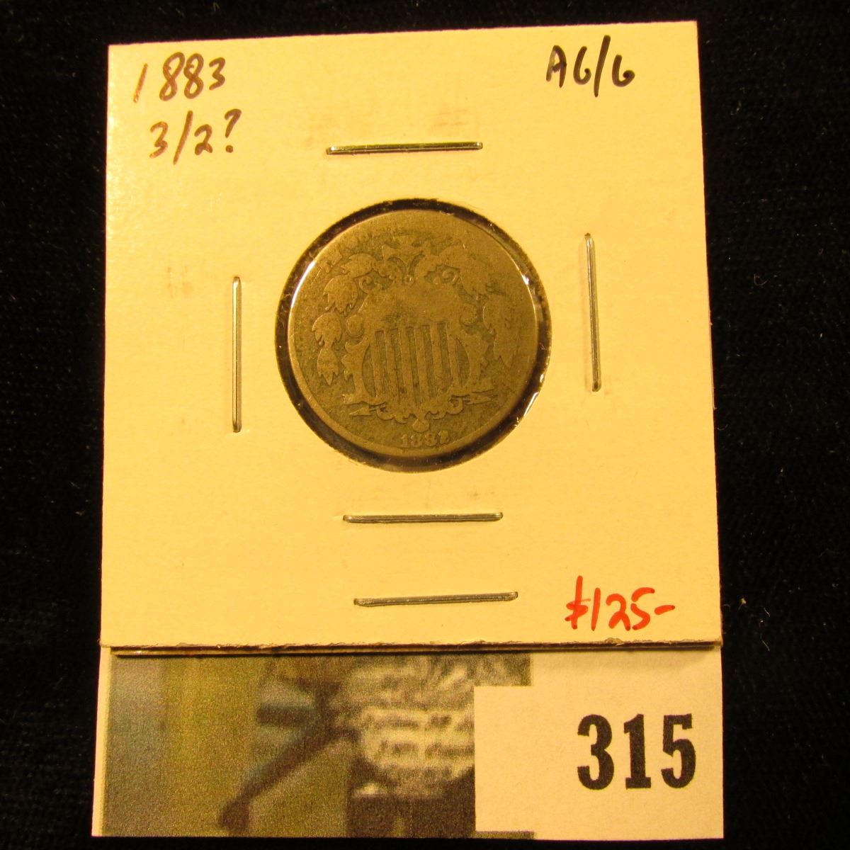 1883, 3 over 2? Shield Nickel, AG/G – definitely something going on in the last digit of the date, value $125+