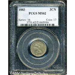 <B>1883<3CN> MS62 PCGS.</B></I> Well detailed with medium gold-gray toning over each side. The somewhat subdued surfaces are free of unsightly spots. A couple of minor, hardly noticeable contact marks are noted on the middle upright of the III. One of just 4,000 business strikes issued, a figure that is even smaller than the proof production. Population: 3 in 62, 18 finer (9/04). <BR><BR><B>Important notice:</B> Heritage usually auctions material at the rate of 200-250 lots per hour. On some occasions eBay Live bid software or the Internet may not be able to keep up with the pace of the auction. We recommend placing a realistic absentee bid now as insurance to avoid disappointment. Occasionally the auctioneer may eliminate or reject an eBay Live bid, and the auctioneer may also reopen a lot after the close of the eBay live bidding (usually because we missed an audience bid), and may reject your bid even if it shows you as the winning bidder. By bidding via eBay Live, you agree that Heritage may award the lot to another bidder at its sole discretion under the circumstances described above or any other reasonable circumstances. Since eBay bids are not shown to us until we open the lot on the floor, we treat those bids just like floor bids. In most cases the floor responds before the eBay bid is presented to us, due to Internet lag time, so for consistency we have made it a policy that floor bids are always considered first over tie eBay live bids. Also please note that all Heritage lots purchased through eBay Live carry a 20% Buyer's Premium. Please make sure you read the Terms and Conditions before you bid.