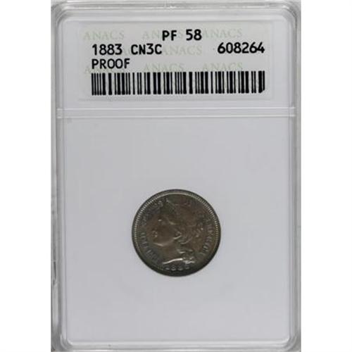 <B>1883 3CN PR58 ANACS.</B></I> NGC Census: (7/1177). PCGS Population (25/1455). Mintage: 6,609. Numismedia Wsl. Price for NGC/PCGS coin in PR58: $190. (#3779)<BR><BR><B>Coin Engraver:</B> James B. Longacre<BR><BR><b>Shipping:</b> Coins & Currency (<a target="_blank" href="http://www.heritageauctions.com/common/shipping.php">view shipping information</a>)
