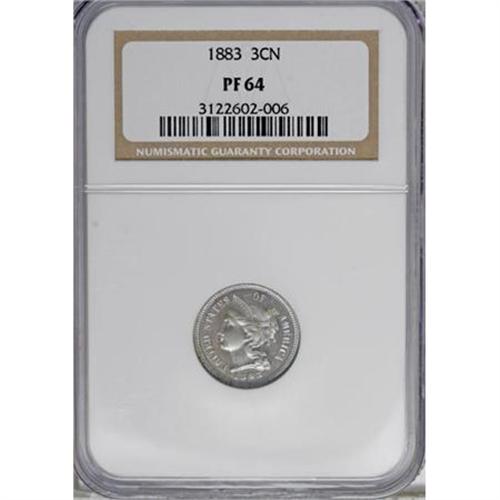 <B>1883 3CN PR64 NGC.</B></I> NGC Census: (274/821). PCGS Population (424/858). Mintage: 6,609. Numismedia Wsl. Price for NGC/PCGS coin in PR64: $340. (#3779)<BR><BR><B>Coin Engraver:</B> James B. Longacre<BR><BR><b>Shipping:</b> Coins & Currency (<a target="_blank" href="http://www.heritageauctions.com/common/shipping.php">view shipping information</a>)