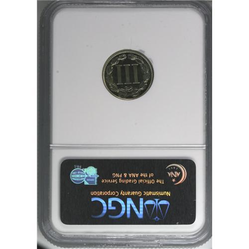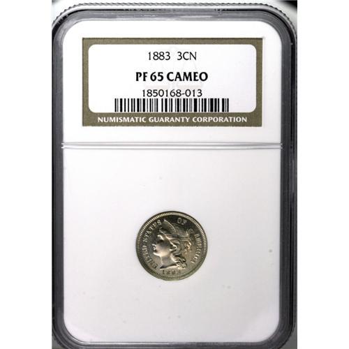 <B>1883<3CN> PR65 Cameo NGC.</B></I> More proofs were produced in 1883 than any other year with 6,609 pieces struck. While plentifully available as a non-cameo, the 1883 is quite challenging with cameo contrast. This Gem has glassy, mirrored fields and a moderate but noticeable amount of mint frost over the devices. Even golden toning covers each side. Census: 15 in 65, 44 finer (8/06).