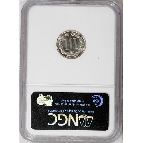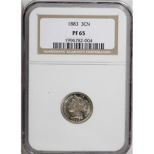 <B>1883<3CN> PR65 NGC.</B></I> The gold-gray fields have moderate mirrors and the devices have subtle layers of rose and ivory toning. A nicely detailed and charming coin.
