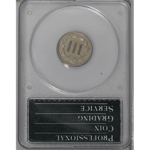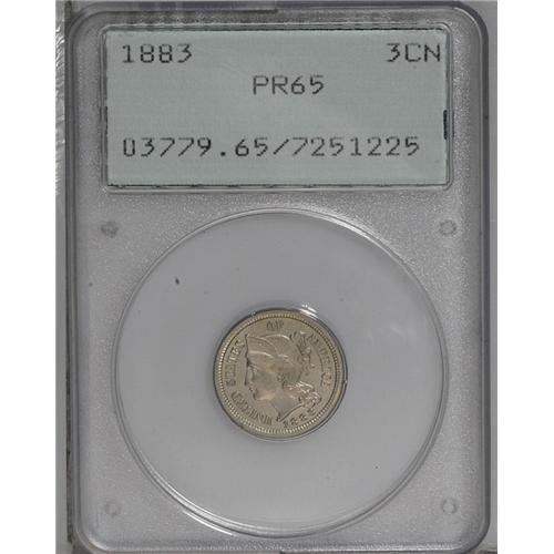 <B>1883<3CN> PR65 PCGS.</B></I> This Gem has smooth pearl-gray surfaces, lightly toned gold-green in the fields, with typical reflectivity for this issue. Two small dark spots are noted on the reverse, one on the last I of III. Housed in an early holder.