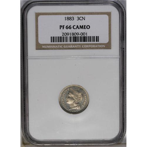 <B>1883<3CN> PR66 Cameo NGC.</B></I> Light golden patina on the obverse is absent on the reverse. Intricately detailed with plenty of contrast between the frosted devices and the deep mirrors.